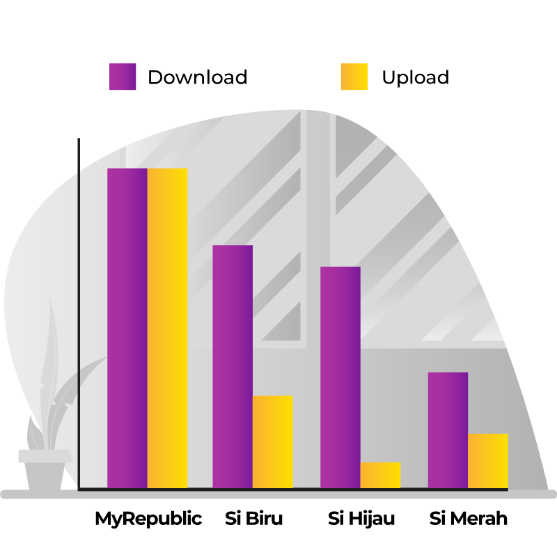 Ketika provider lain menawarkan kecepatan tidak seimbang antara upload dan download, MyRepublic berani memberikan kecepatan yang simetris 1:1 untuk keduanya.